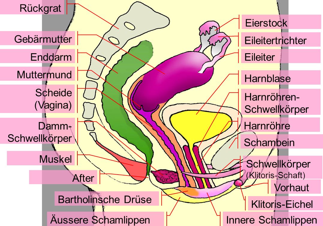 Hinterm Schambein befindet sich die Harnblase, das Ende der Harnröhre befindet sich knapp unter der Klitoris. Manchmal weiter außen, manchmal weiter innen am Scheideneingang. Die Scheide führt unter dem Harnleiter nach hinten, und macht entlang der Harnblase eine Kurve nach oben, wo sie sich weitet, um der Cervix Raum zu geben.